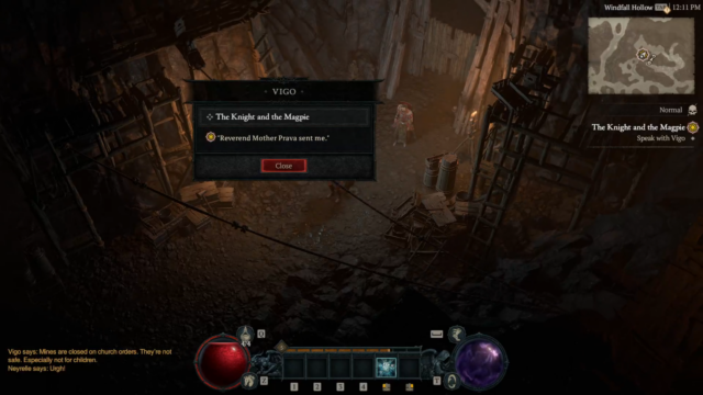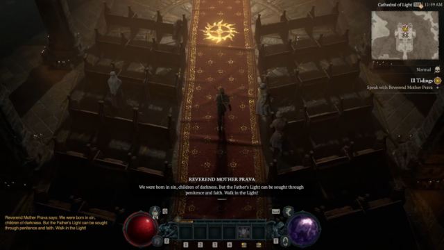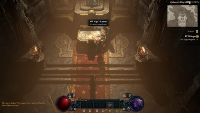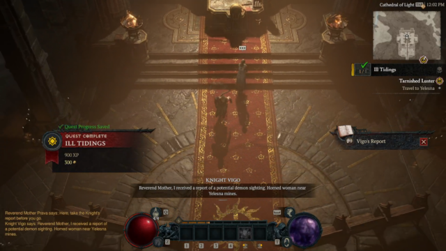 - Ill Tidings – Visit the Cathedral of Light to speak with Reverend Prava about Lilith’s (evil horned demon) return and seek their support against her. Prava responds with “Vigo’s Report” quest item and directs the player to Yelesna to find out more