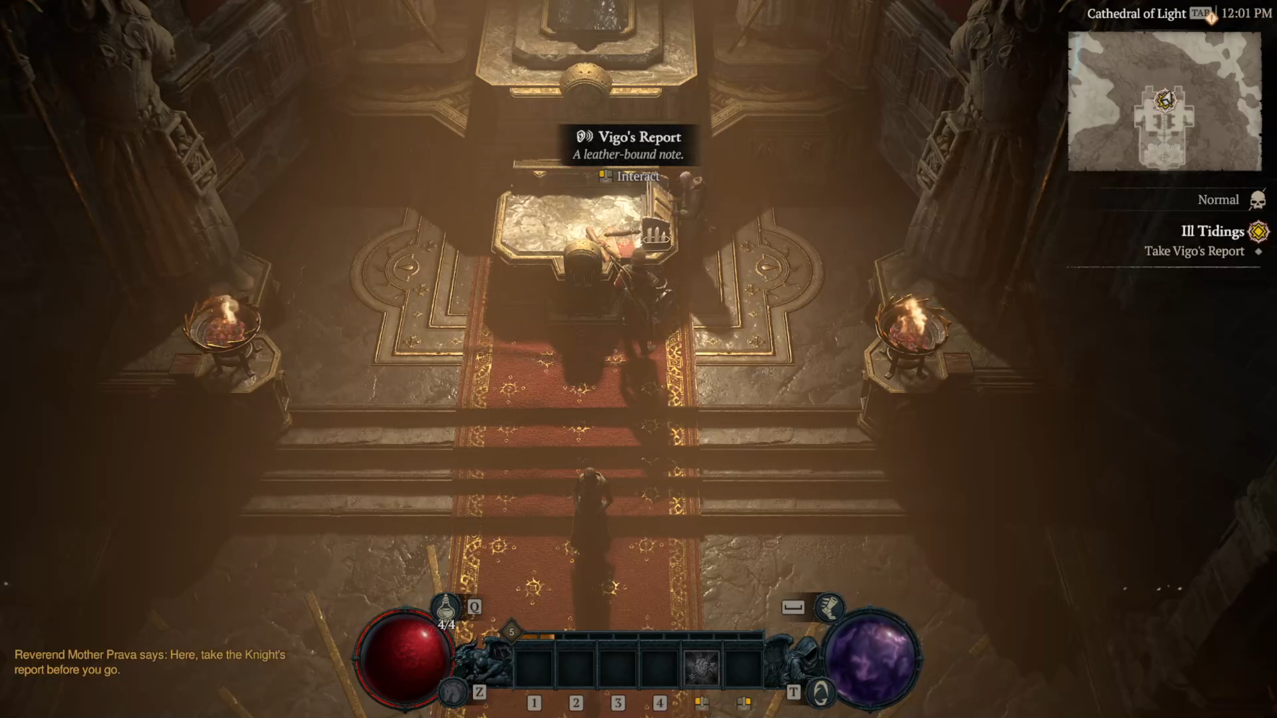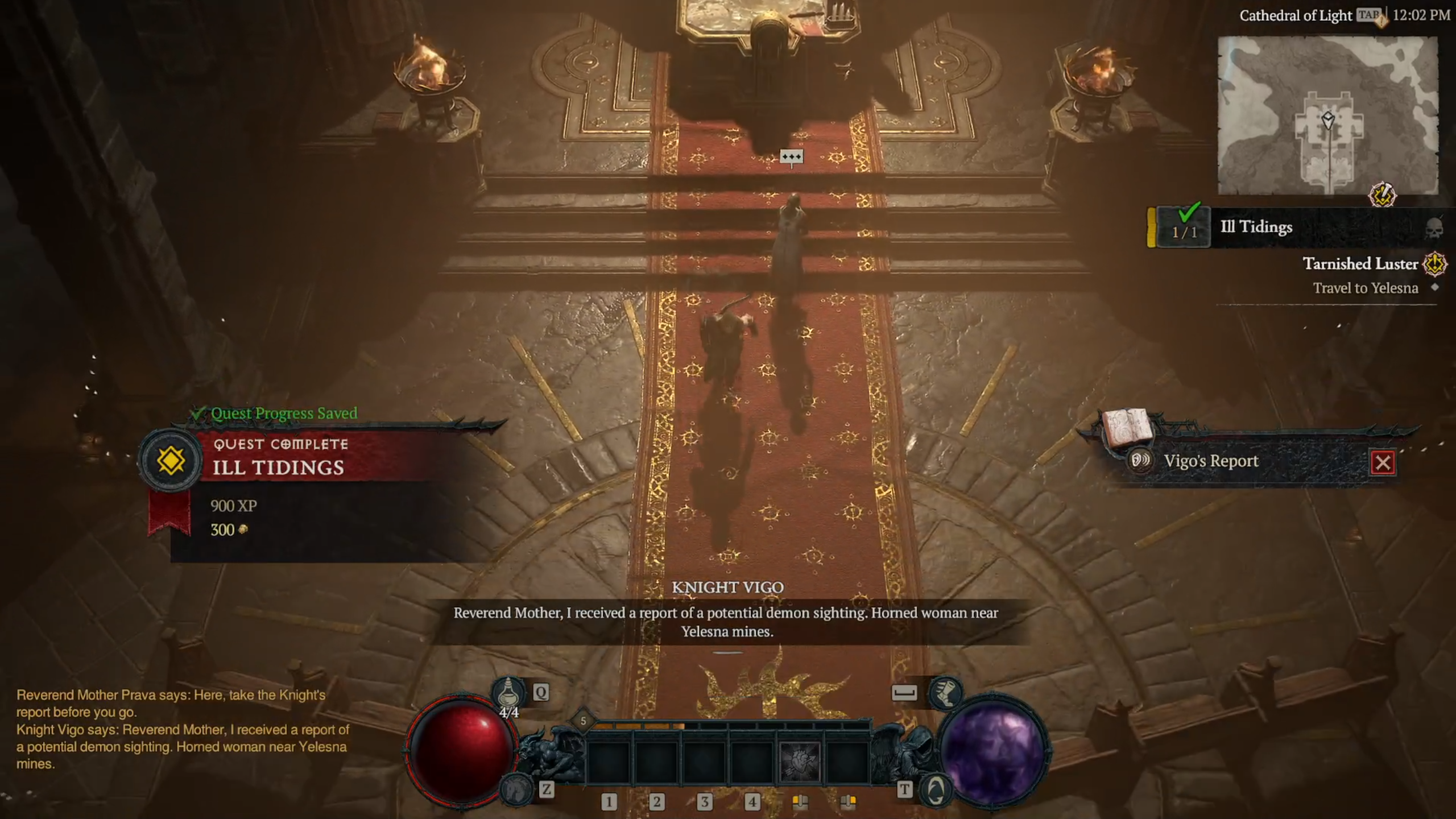 • Ill Tidings – Visit the Cathedral of Light to speak with Reverend Prava about Lilith’s (evil horned demon) return and seek their support against her. Prava responds with “Vigo’s Report” quest item and directs the player to Yelesna to find out more
