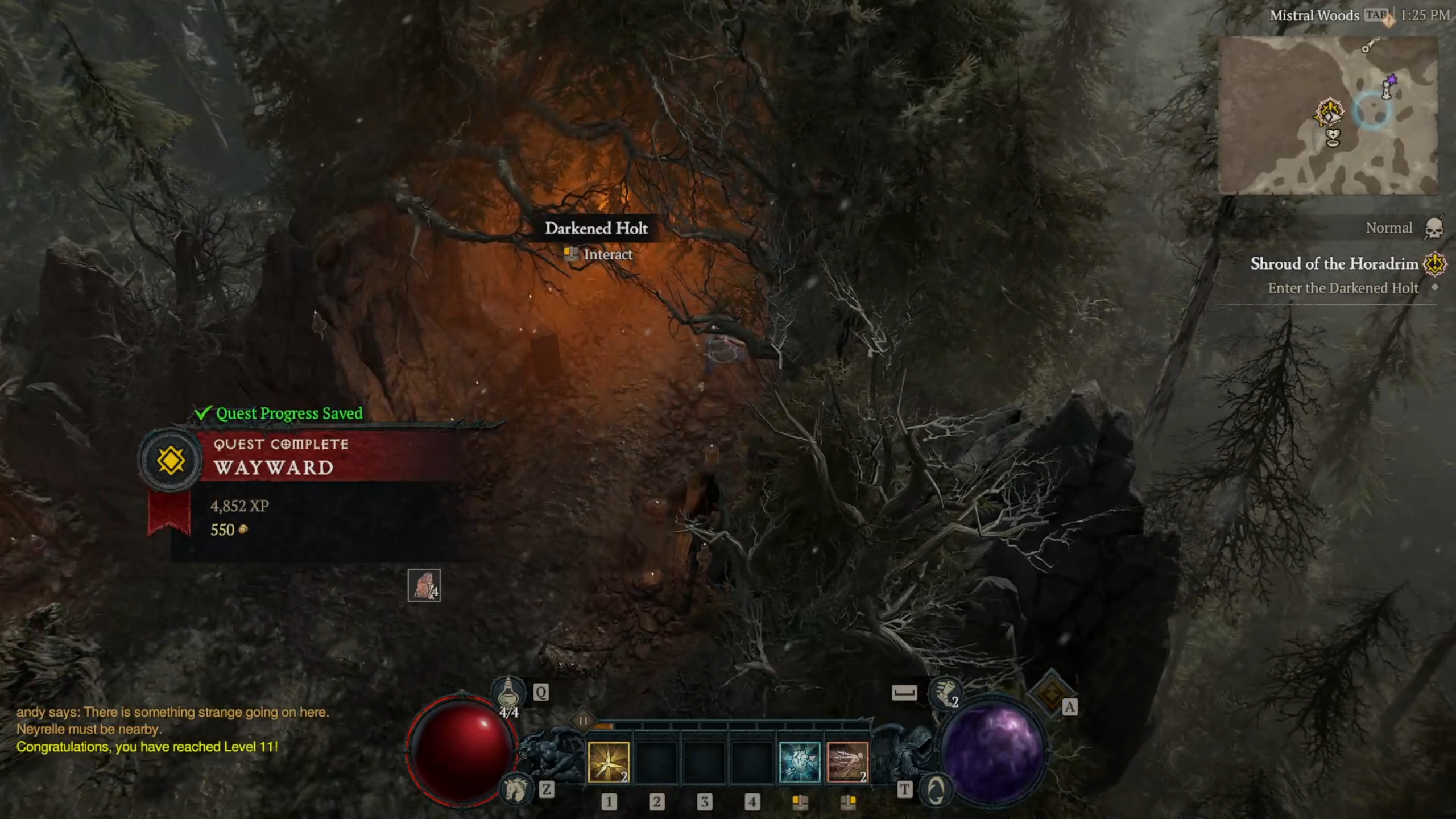 • Wayward – The player searches for Neyrelle in the Mistral Woods after she left to find the hidden Horadric Vault; when you stumble upon a glowing tree, leading you into the the Darkened Holt dungeon.