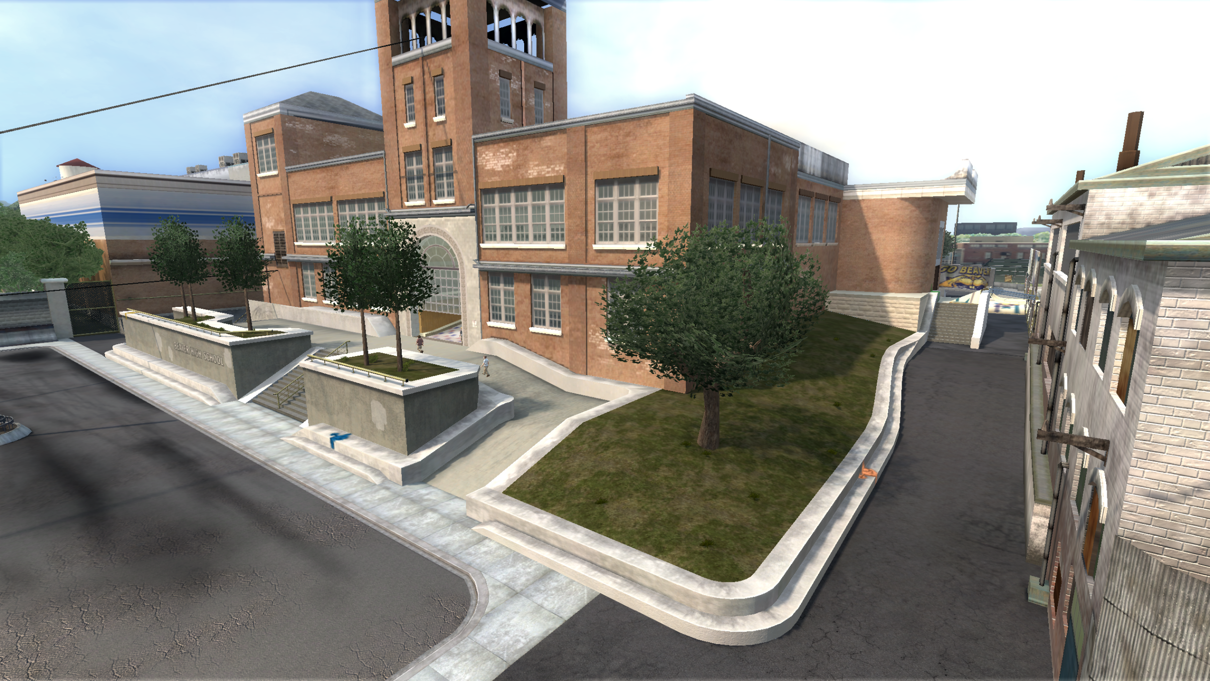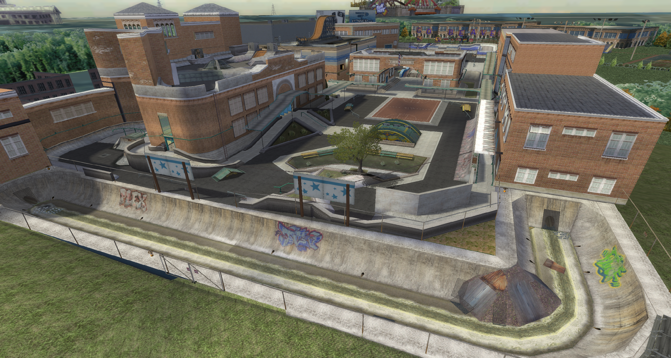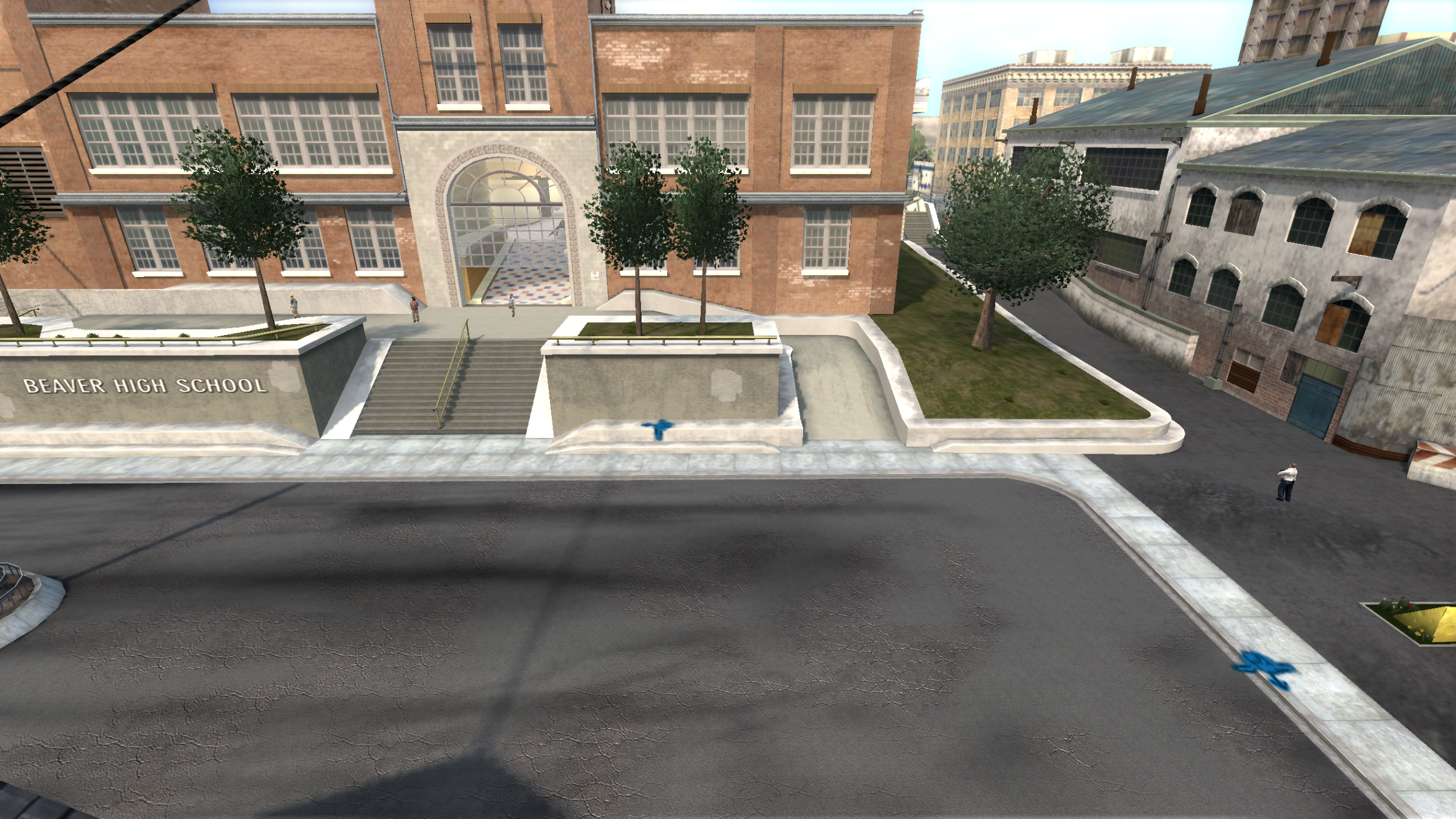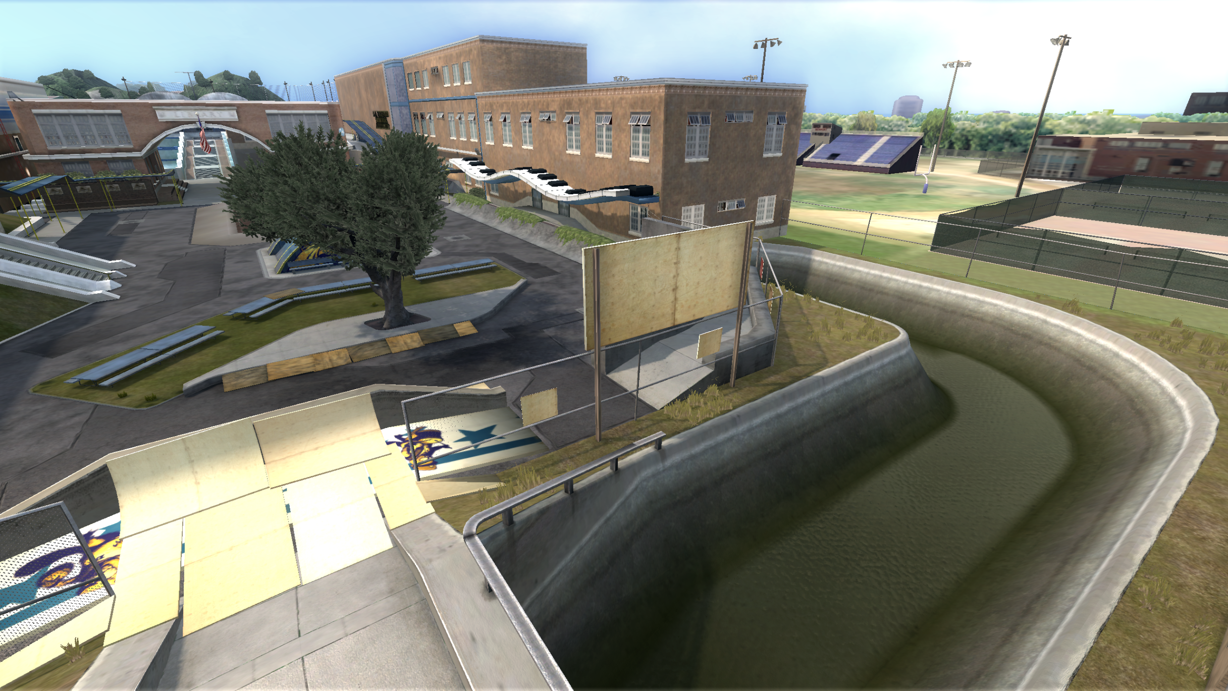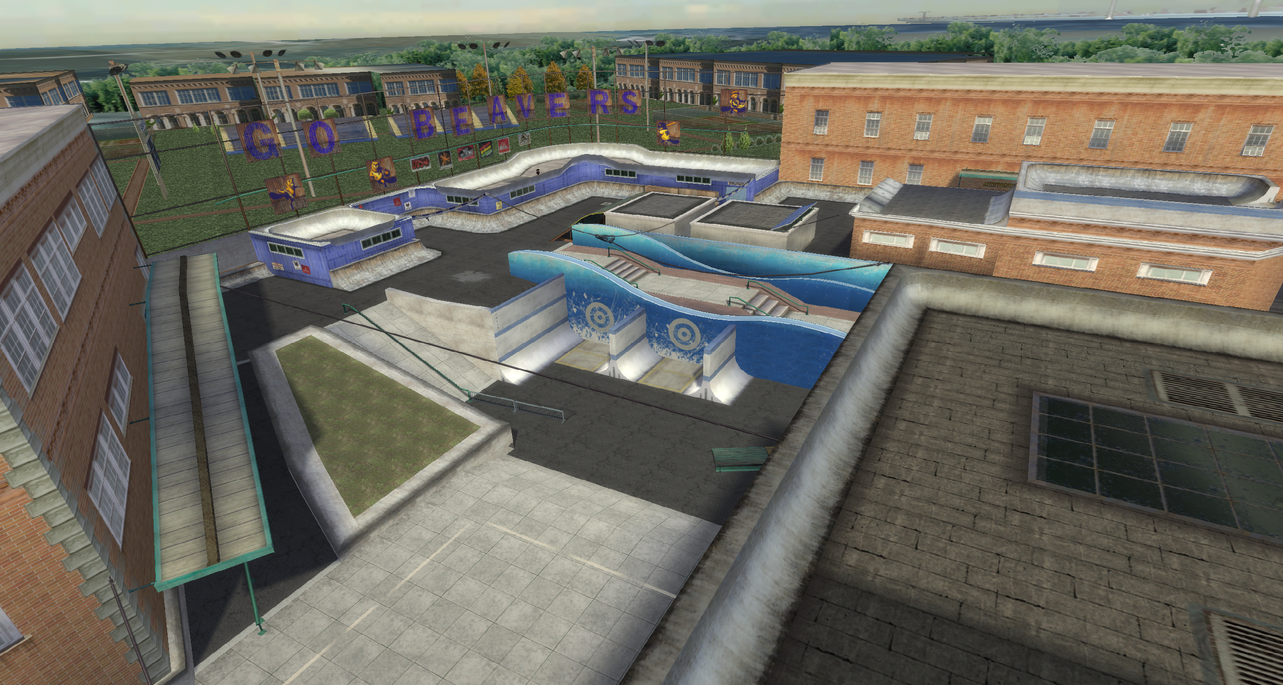 My main objective was to build a fun School level with a skateable exterior *and* interior. Up until this point, there have been at least 3 school levels in the series but none with skateable interior hallways.