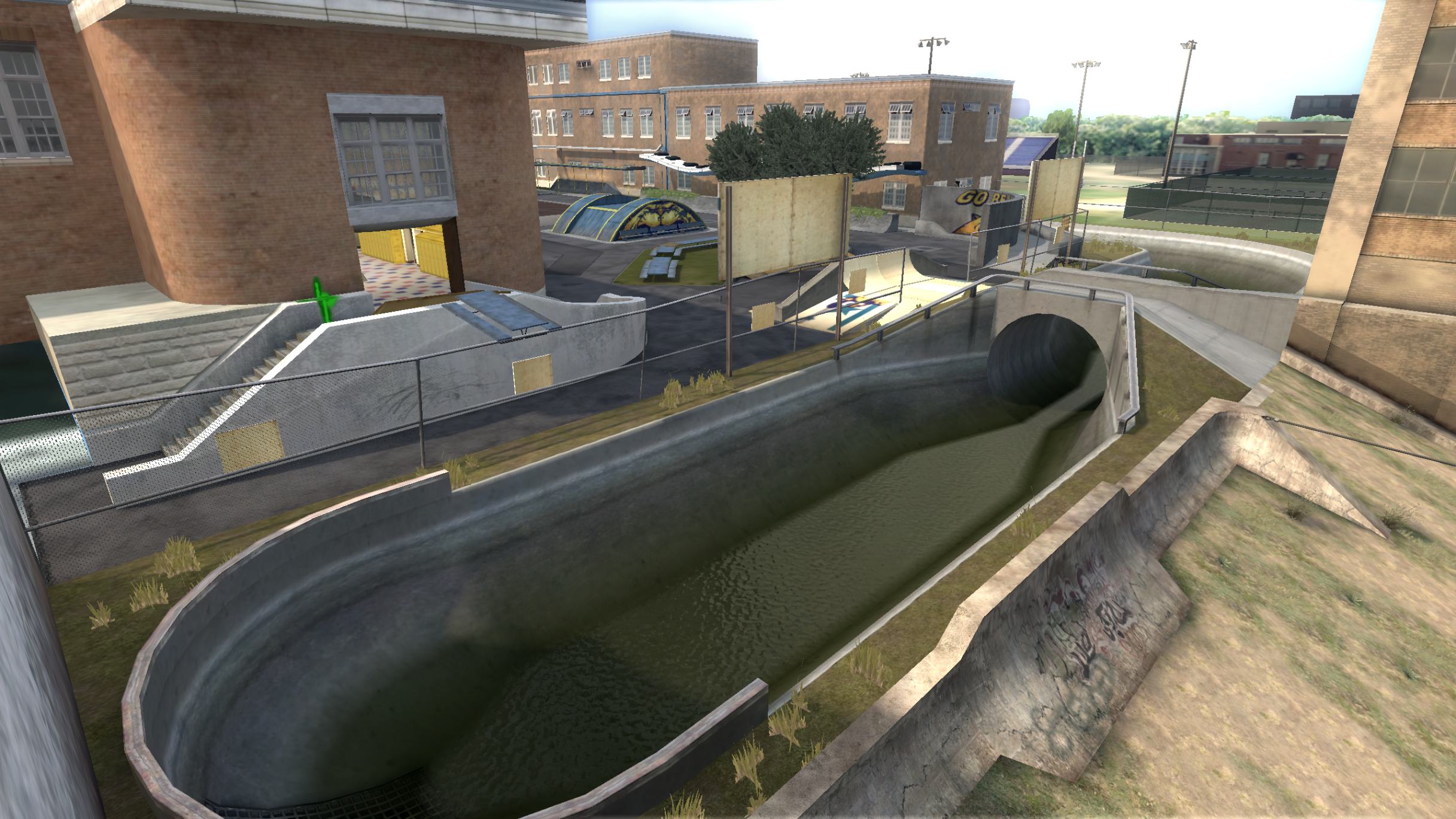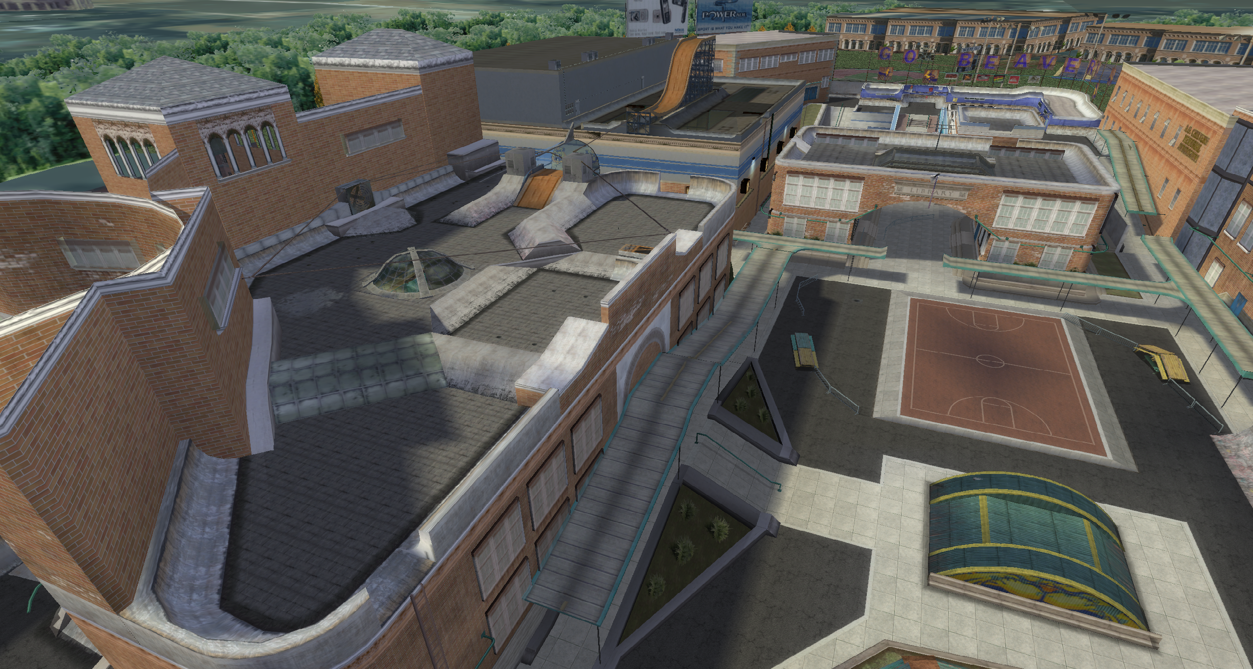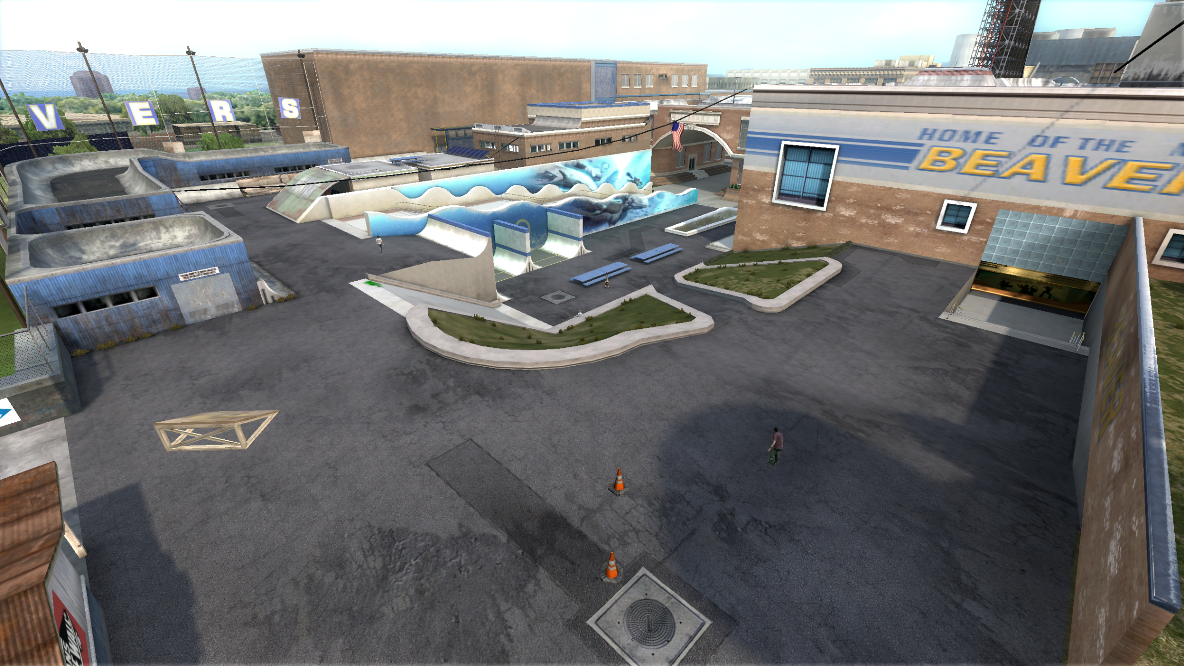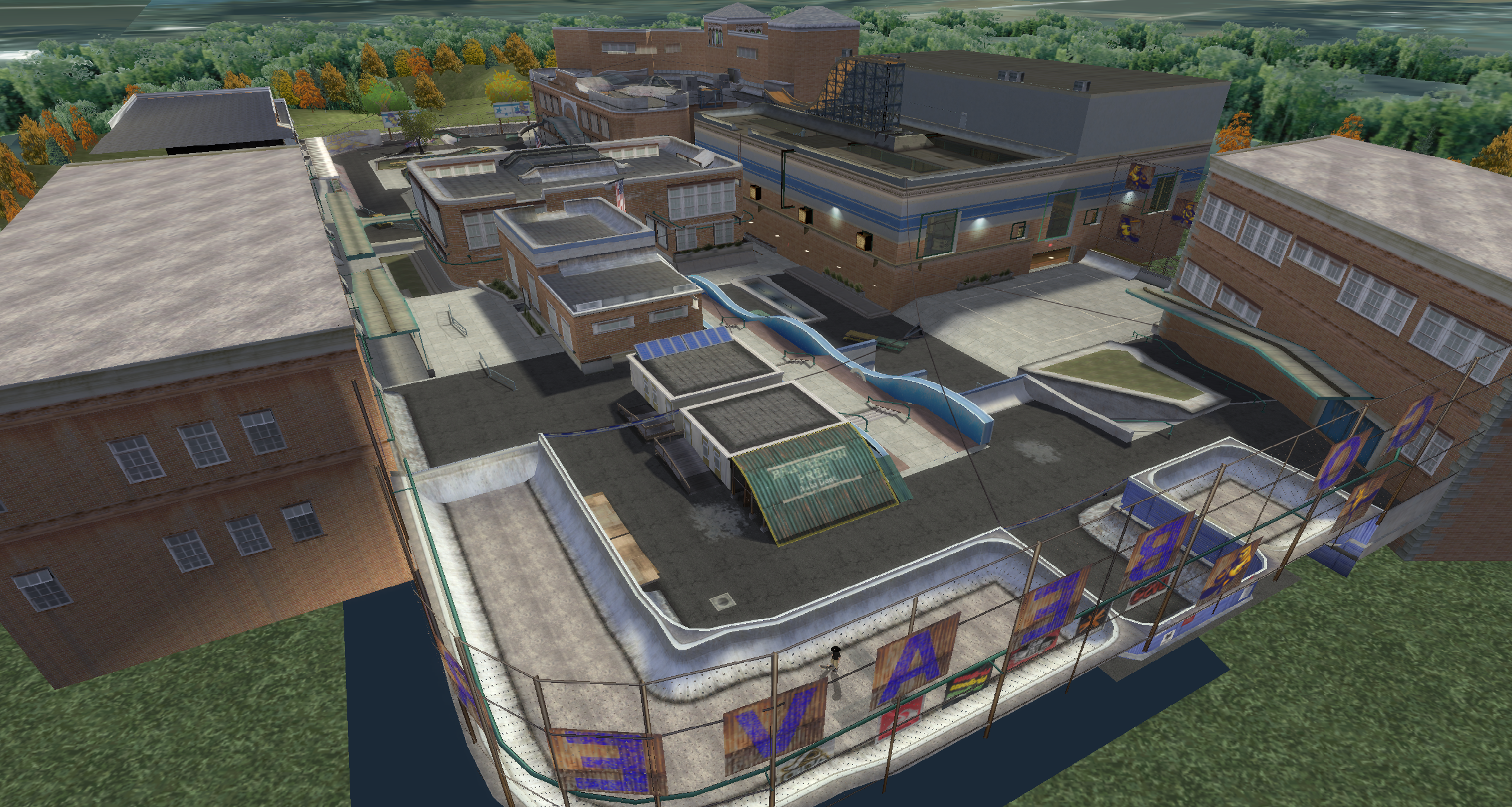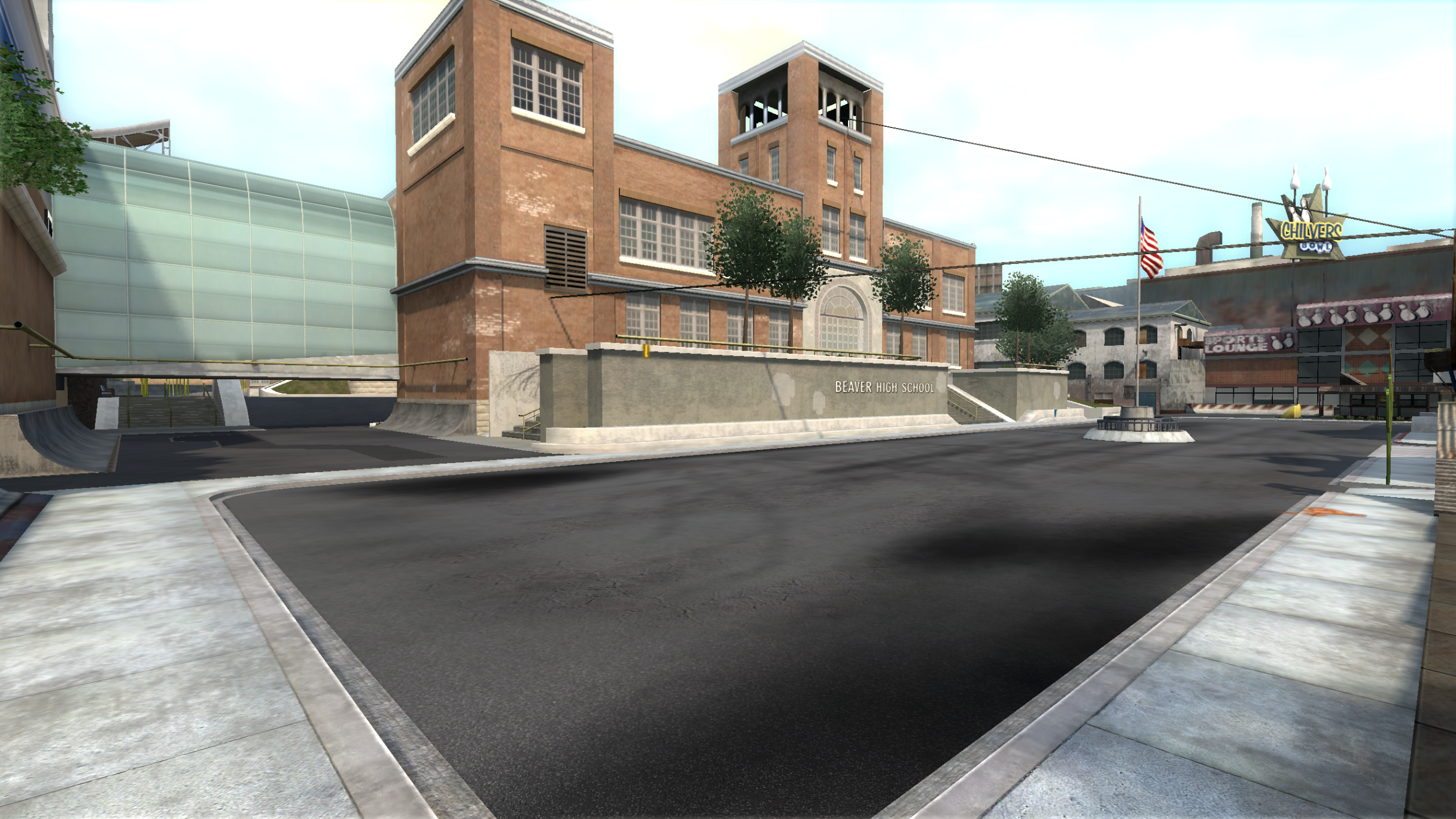 My main objective was to build a fun School level with a skateable exterior *and* interior. Up until this point, there have been at least 3 school levels in the series but none with skateable interior hallways.