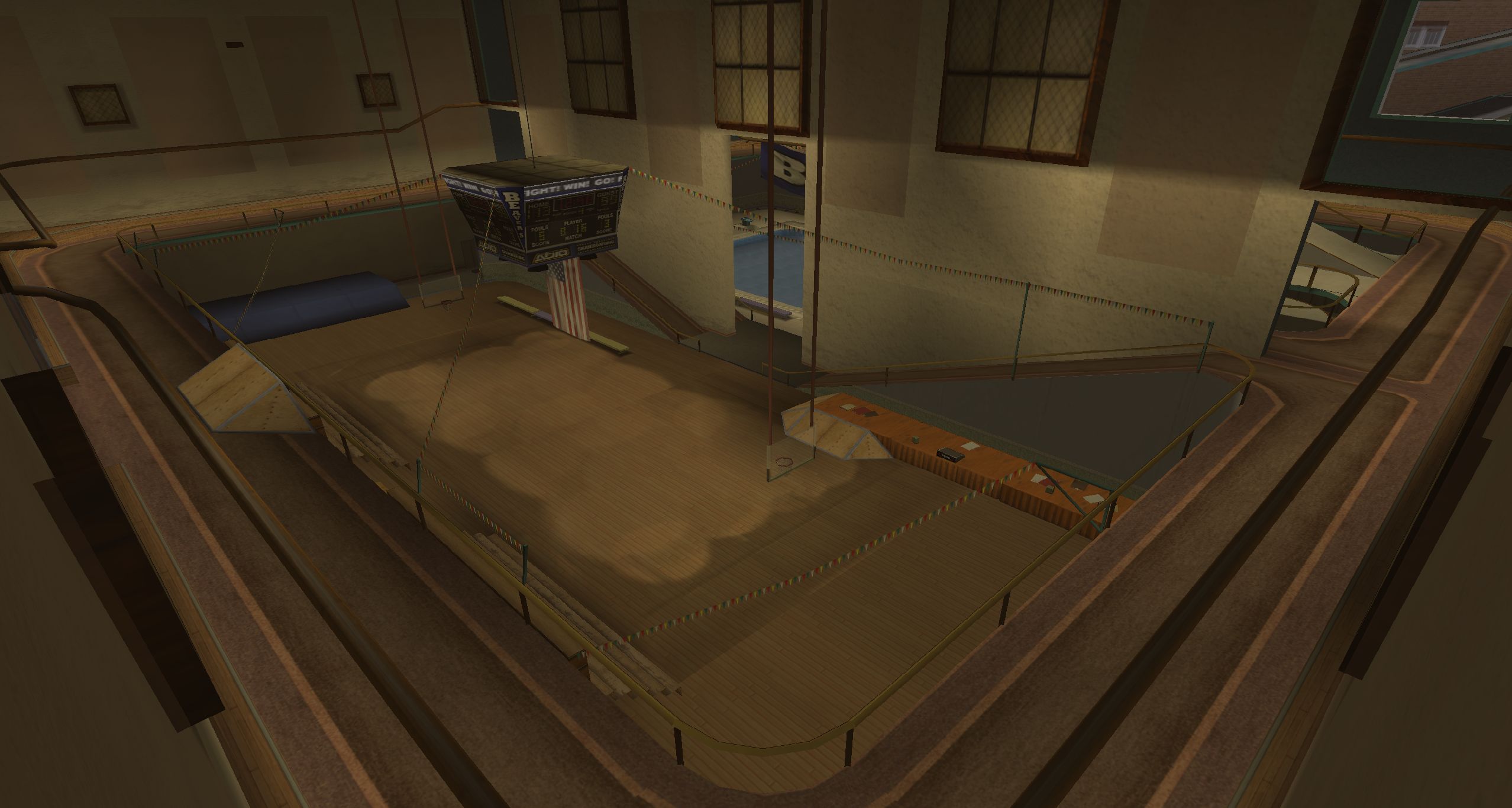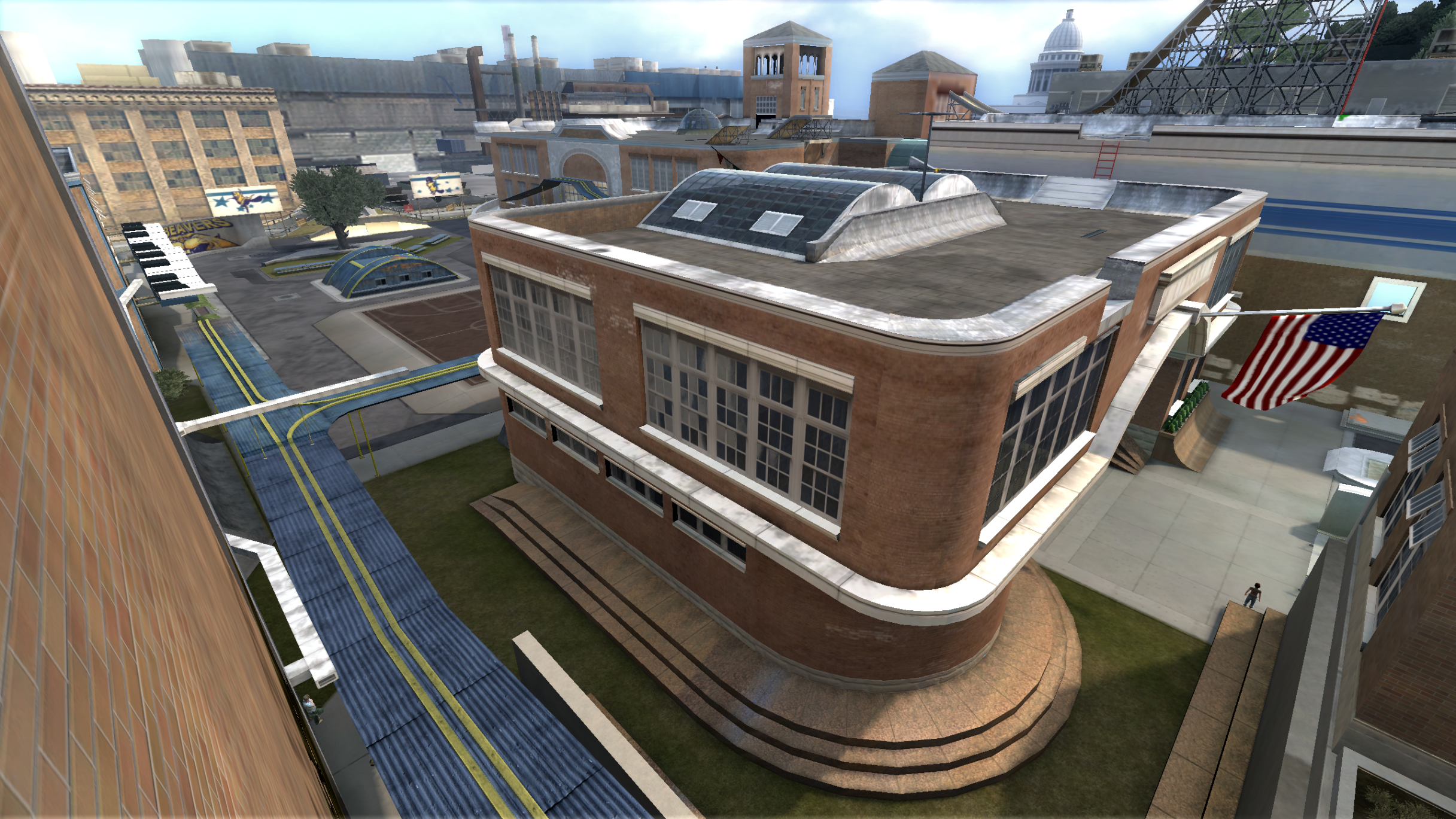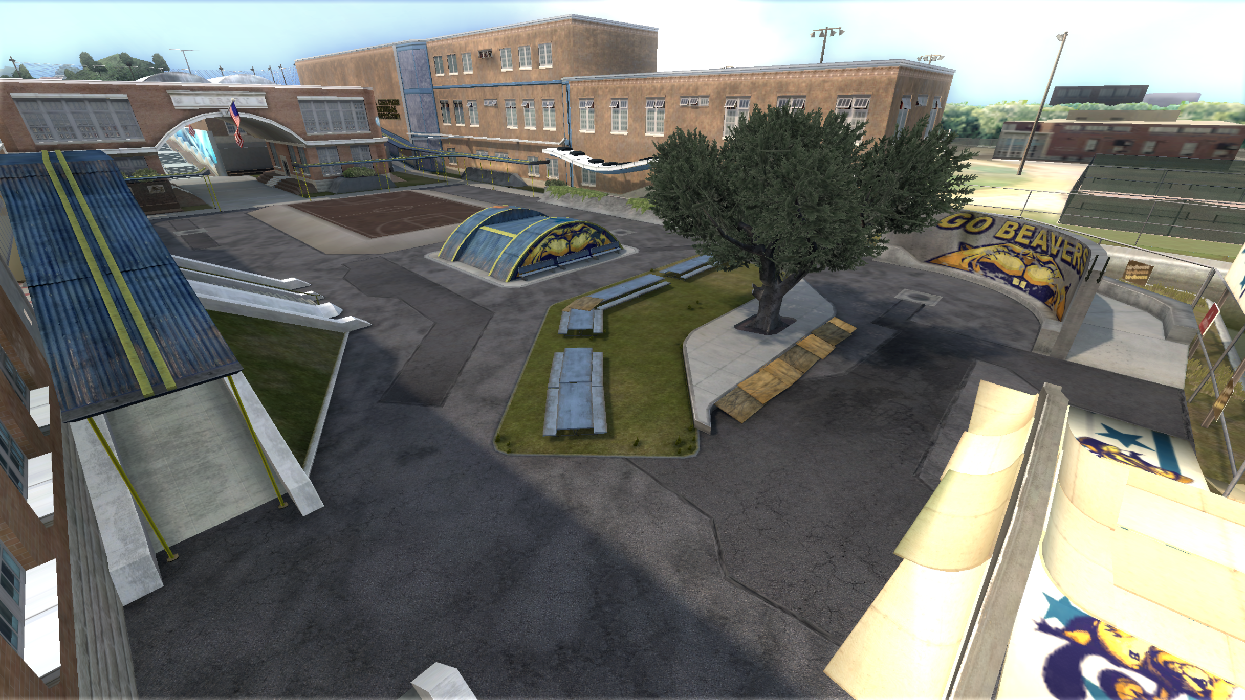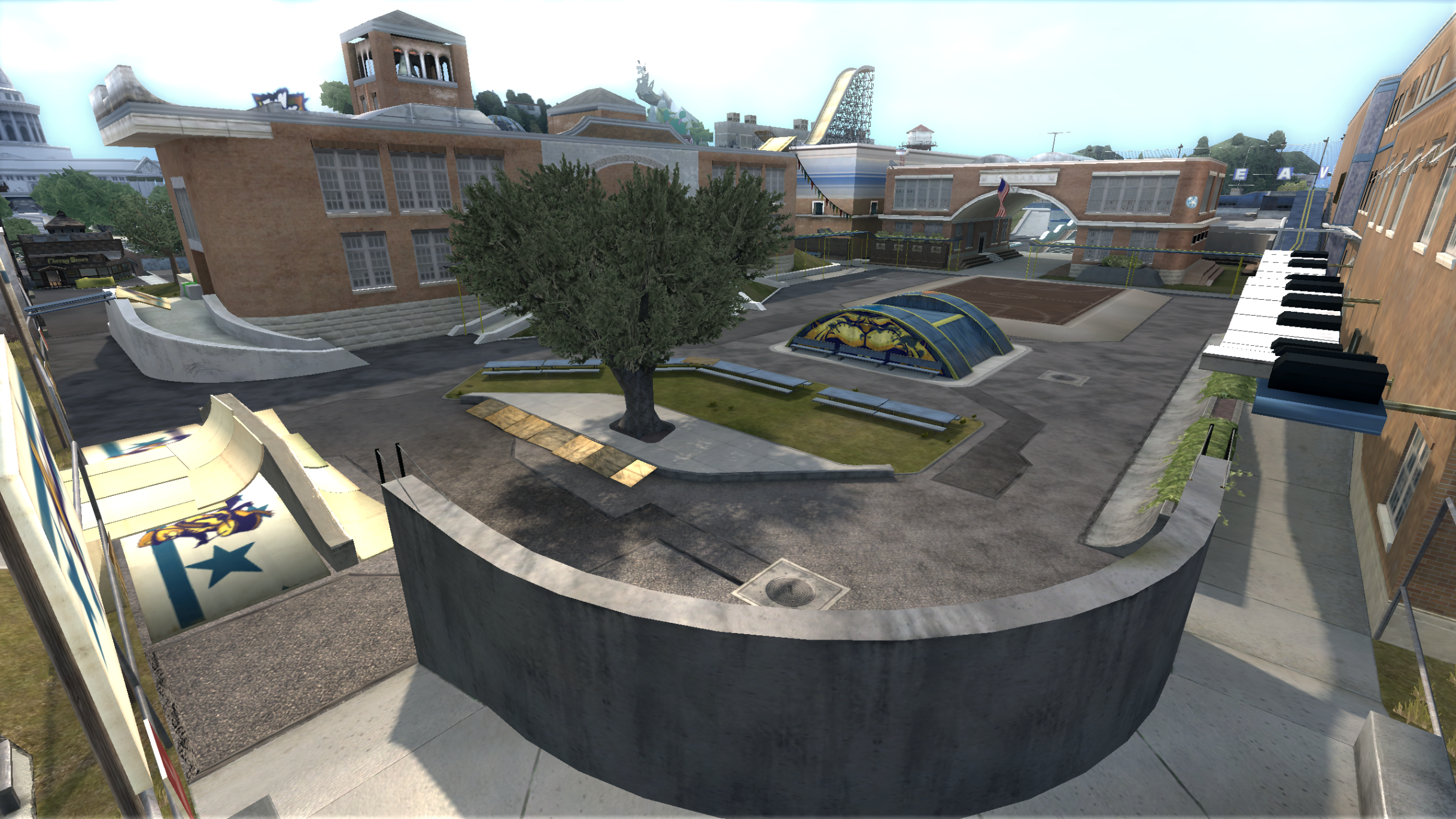 My main objective was to build a fun School level with a skateable exterior *and* interior. Up until this point, there have been at least 3 school levels in the series but none with skateable interior hallways.