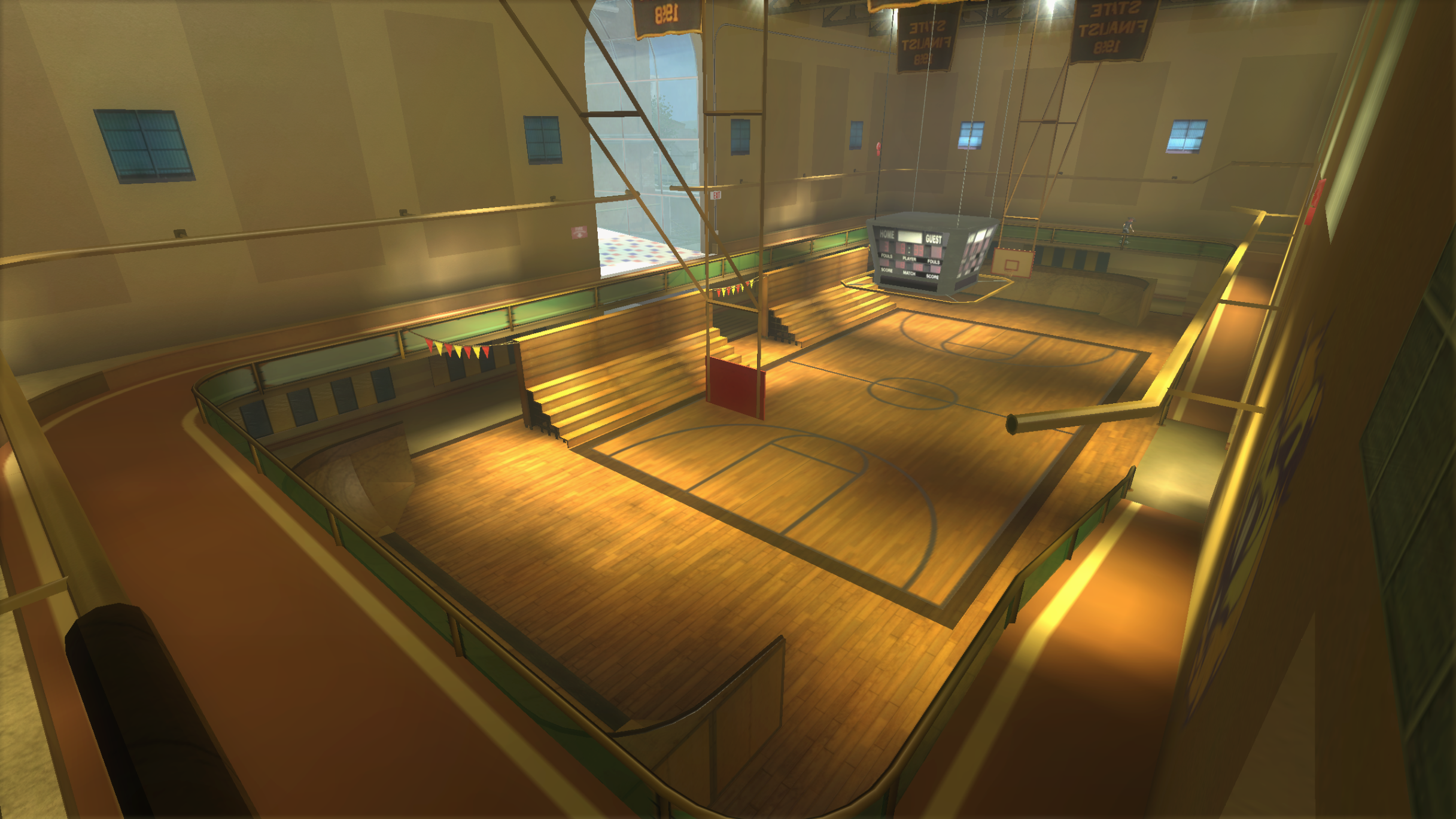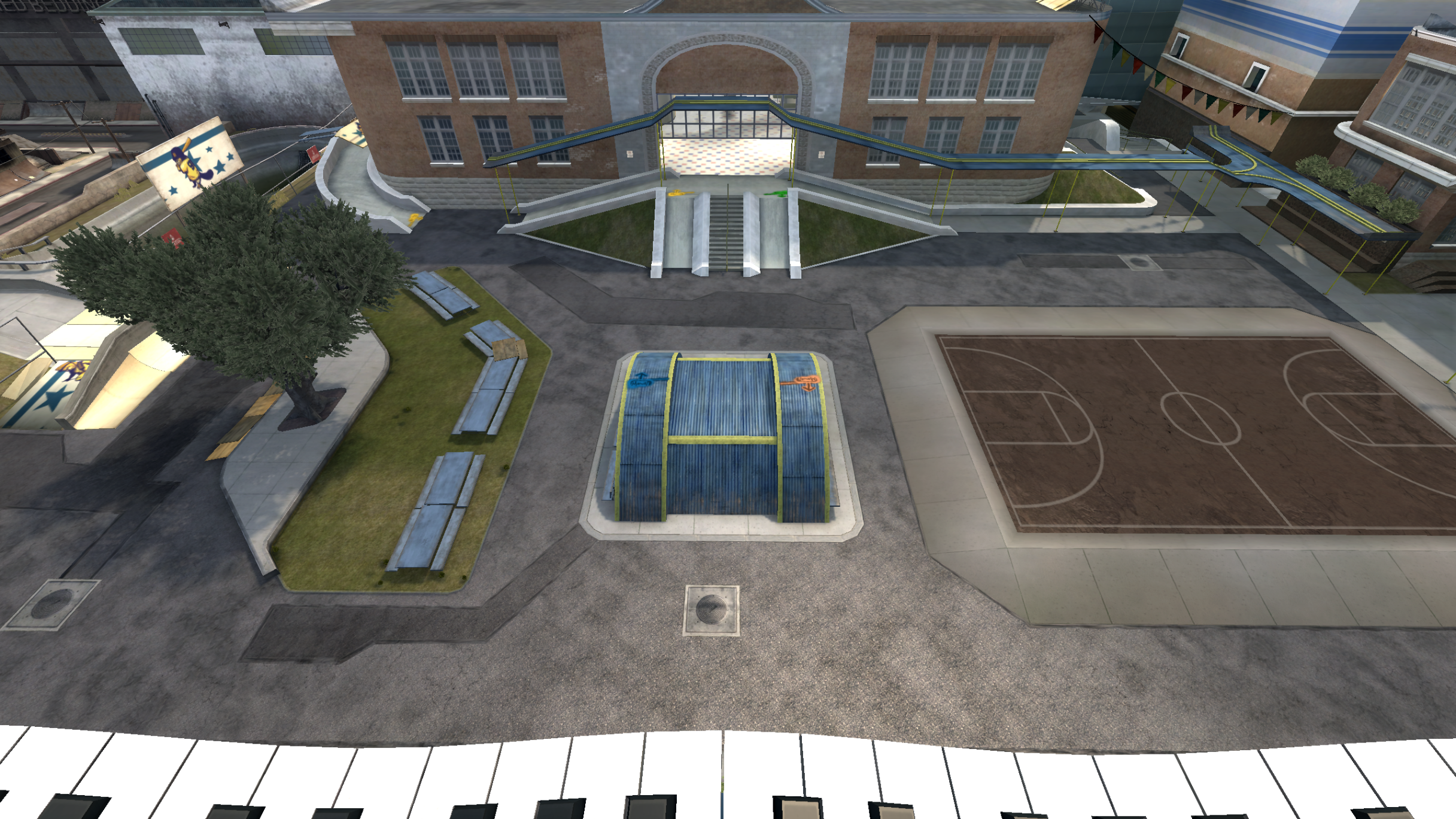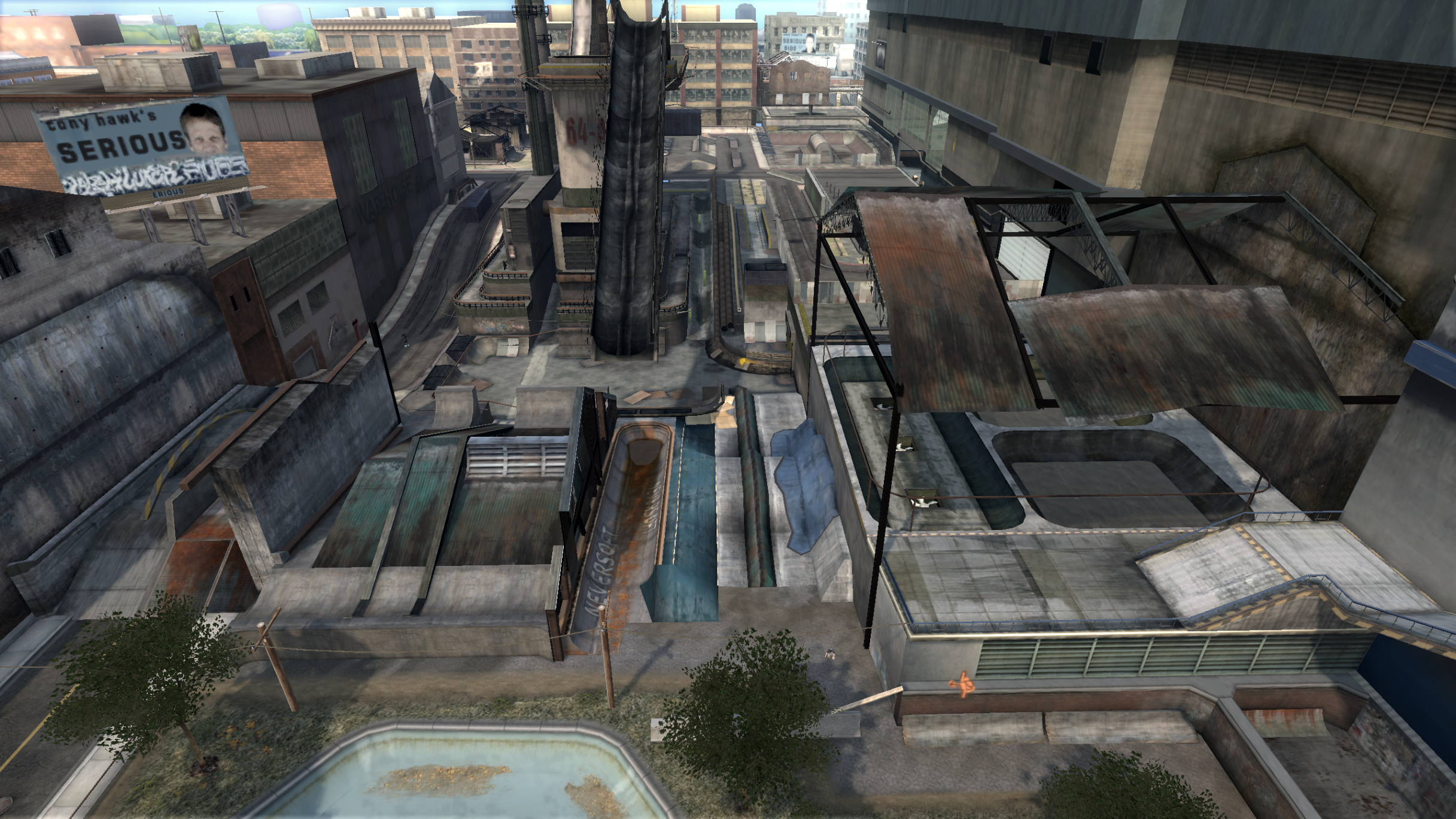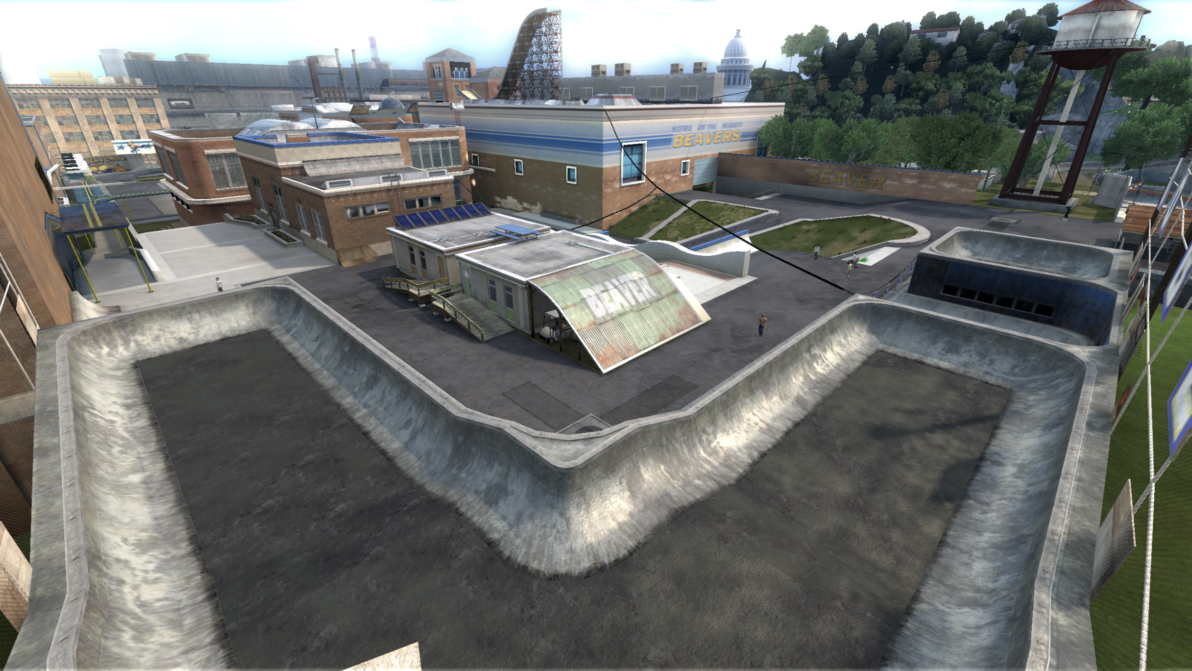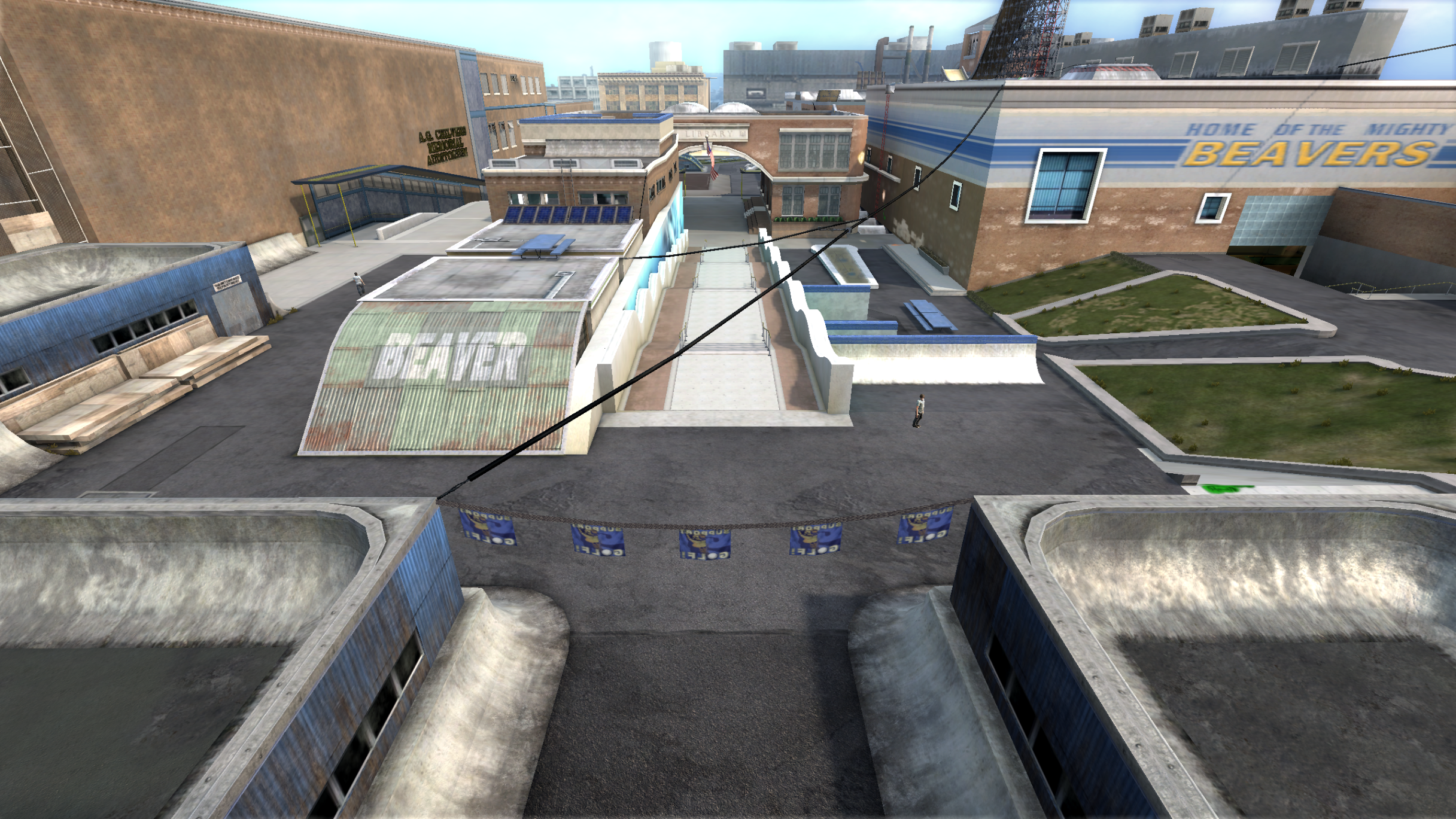 My main objective was to build a fun School level with a skateable exterior *and* interior. Up until this point, there have been at least 3 school levels in the series but none with skateable interior hallways.