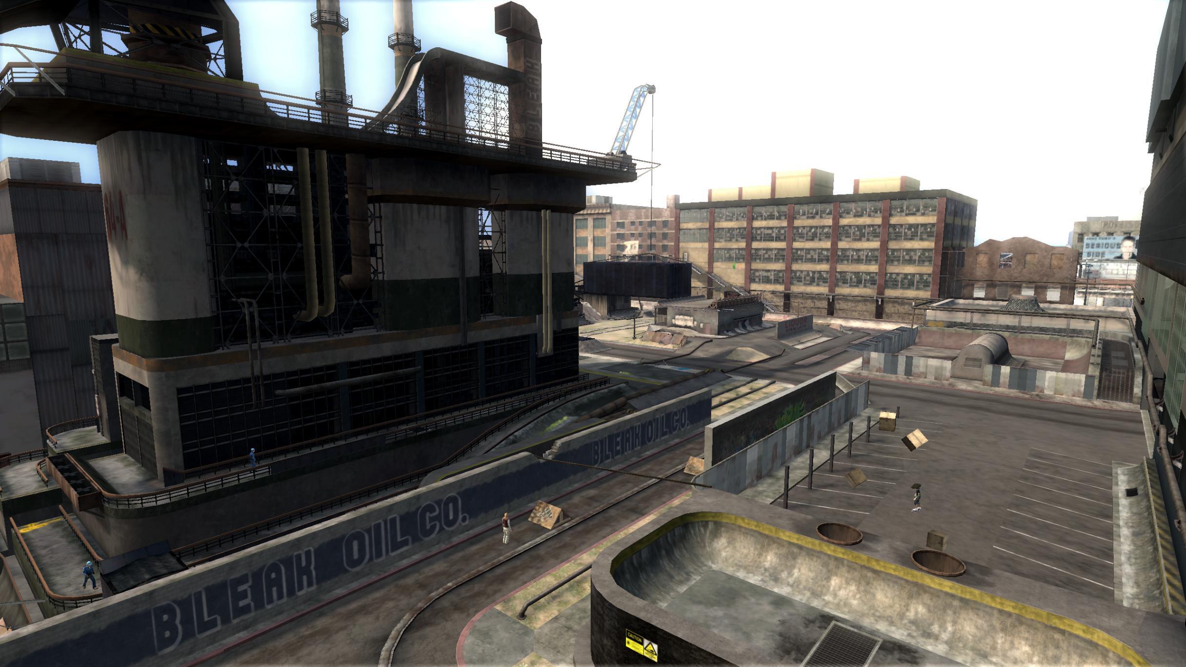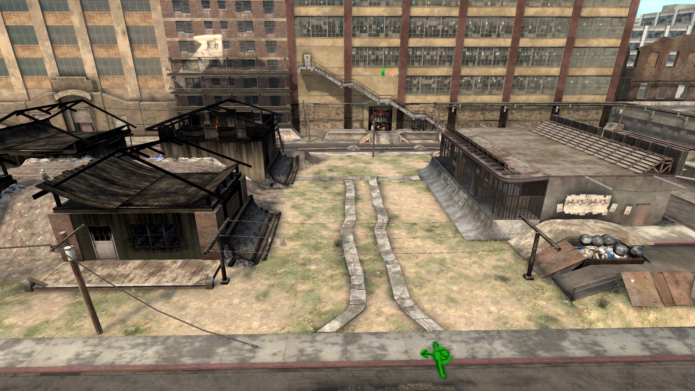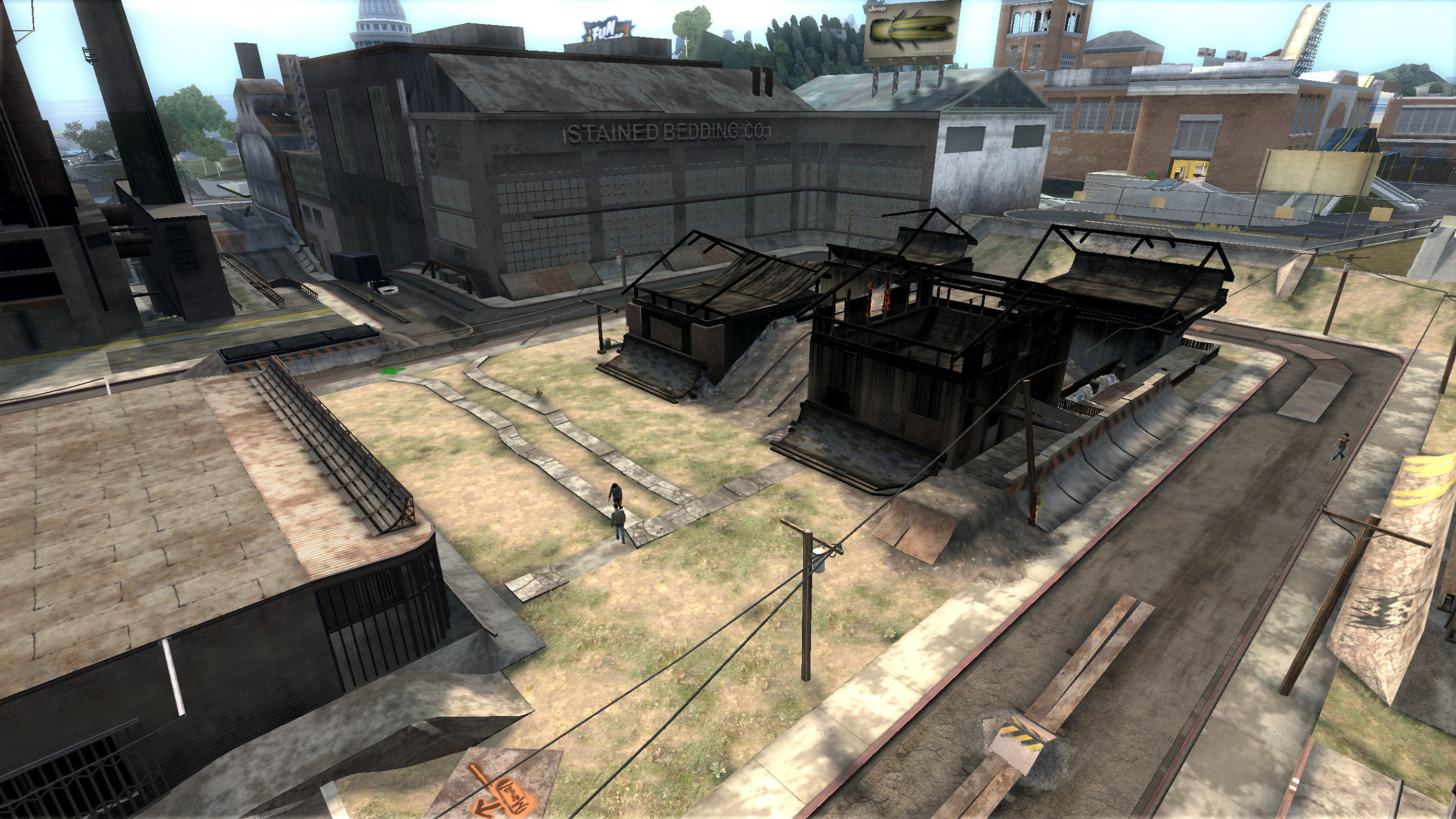 Main directive for the Slums is to serve as a run-down and darker counterpart to the suburbs/houses area (zone where the user starts the game). It needed to connect into both the Factory and Park levels, so I had to come up with level boundaries that would open (after-state) after the player unlocks those areas.